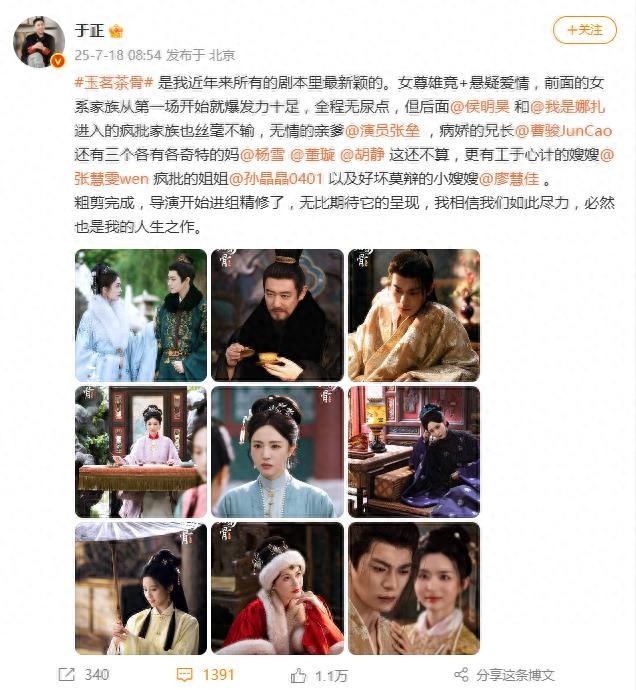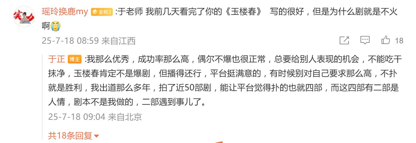 于正对自己的战绩信心满满,解释那4部“扑剧”的原因也很“于正式”:要么是“人情债”接的活儿,剧本没亲自操刀;要么是演员出事、政策调整等“不可抗力”背锅。就连被嘲“无声无响”的《玉楼春》,他也能轻描淡写一句“平台满意,播得还行”,言外之意——你们观众觉得不够火?那是你们标准太高!