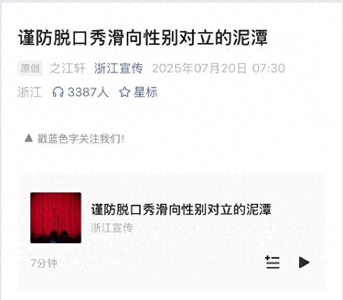 浙江宣传发文提醒“谨防脱口秀滑向性别对立”,评论区直接炸了锅。有网友翻旧账:“以前男的讲黄段子没人管,现在女人吐槽两句就成‘挑事’了?”这话题确实敏感,但咱不站队,就唠几个真实案例。