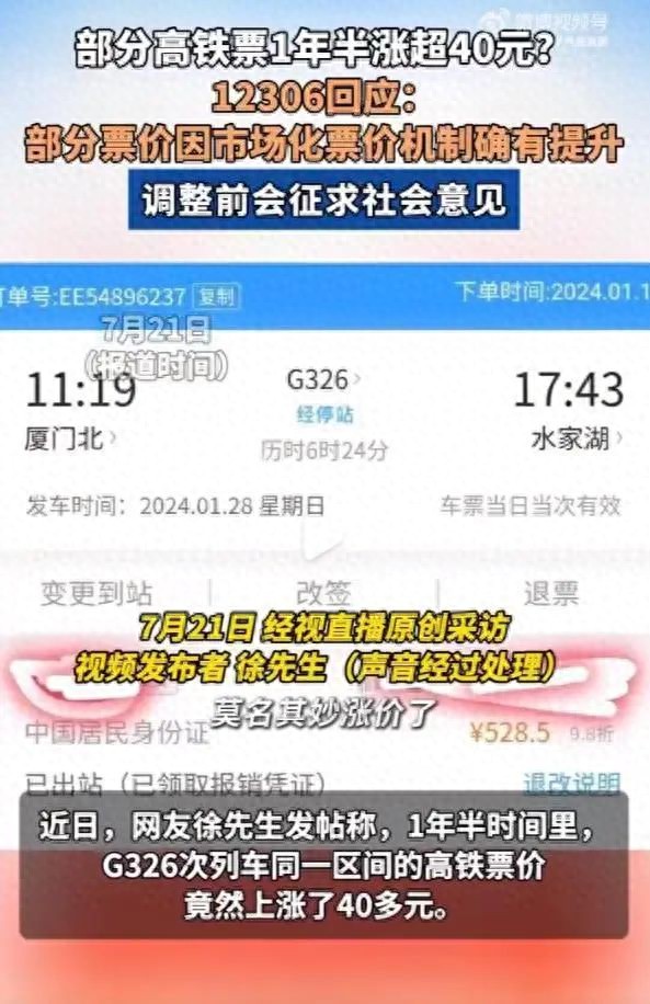 近日,网友徐先生发帖称,1年半时间里,G326次列车同一区间的高铁票价竟然上涨了40多元,引发公众对高铁票价调整机制的关注。