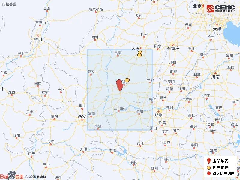 历史地震:根据中国地震台网速报目录,震中周边200公里内近5年来发生3级以上地震共6次,最大地震是2025年1月10日在山西临汾市尧都区发生的4.1级地震(距离本次震中35公里)。历史地震分布如图↓