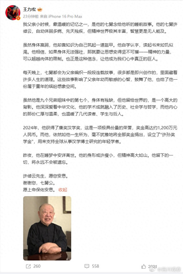 8月5日,王力宏发长文悼念许倬云:昨夜,他在睡梦中安详离世。他的身形或许瘦小,但精神高大如山。他留下的一切,将永远不会被遗忘。