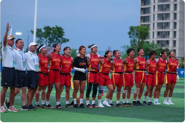 历史性的一刻到来了!在16日成都世运会女子腰旗橄榄球5-8名安慰赛半决赛中,中国队以28:22战胜日本队。从选拔到建队不满五个月的中国队,获得了队史第一场正式比赛胜利!