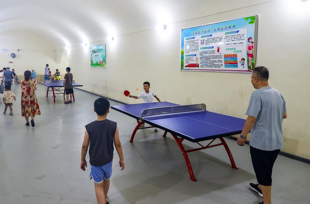 武汉市民在蛇山人防工程纳凉点内打乒乓球。(图/视觉中国/中新社记者张畅)