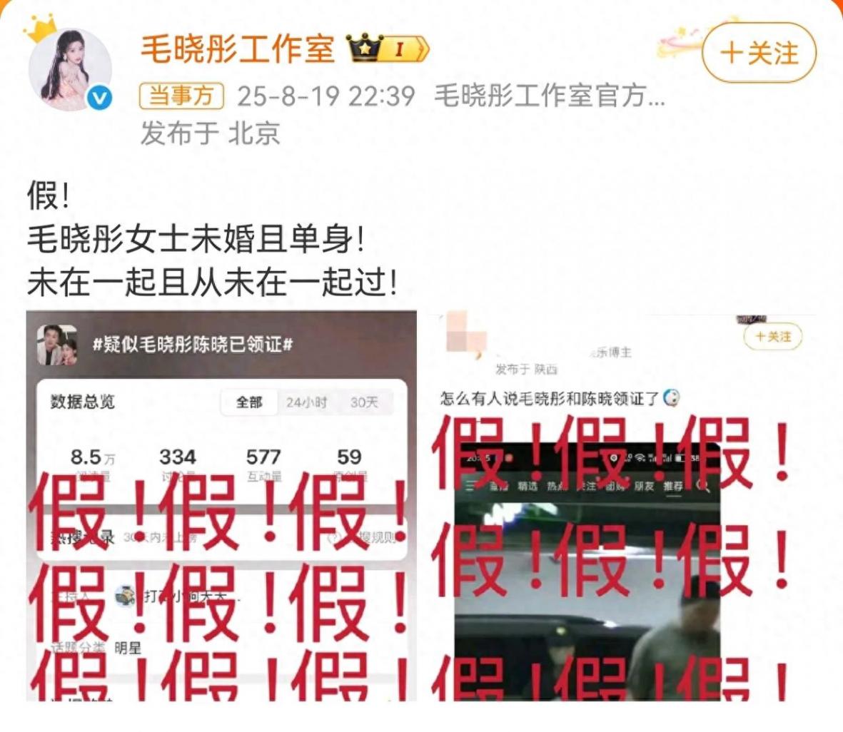 8月19日晚,毛晓彤工作室官方账号发文称:“毛晓彤女士未婚且单身!未在一起且从未在一起过!”从工作室发布的图片上可以看到,毛晓彤方所否认的传言是“疑似毛晓彤陈晓已领证”。