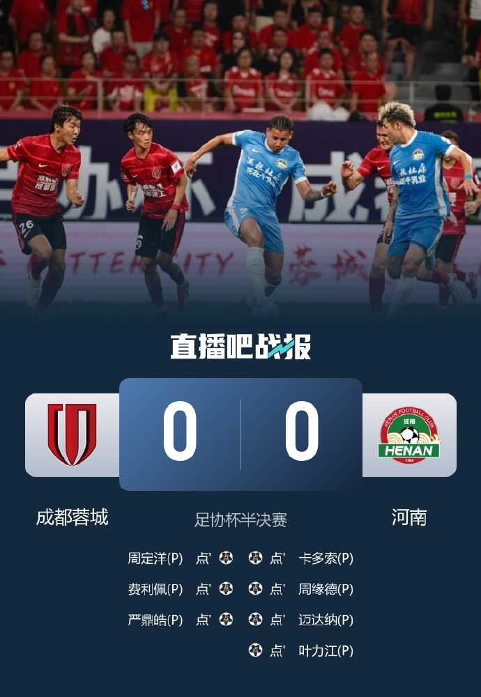 在加时赛期间,两队依然无法取得破门,比赛不得不被拖入点球大战。其间,河南队5罚4中,蓉城队5罚3中,最终河南队以4比3战胜对手,历史上首次跻身足协杯决赛。这也意味着足协杯可能迎来一支新的冠军球队。