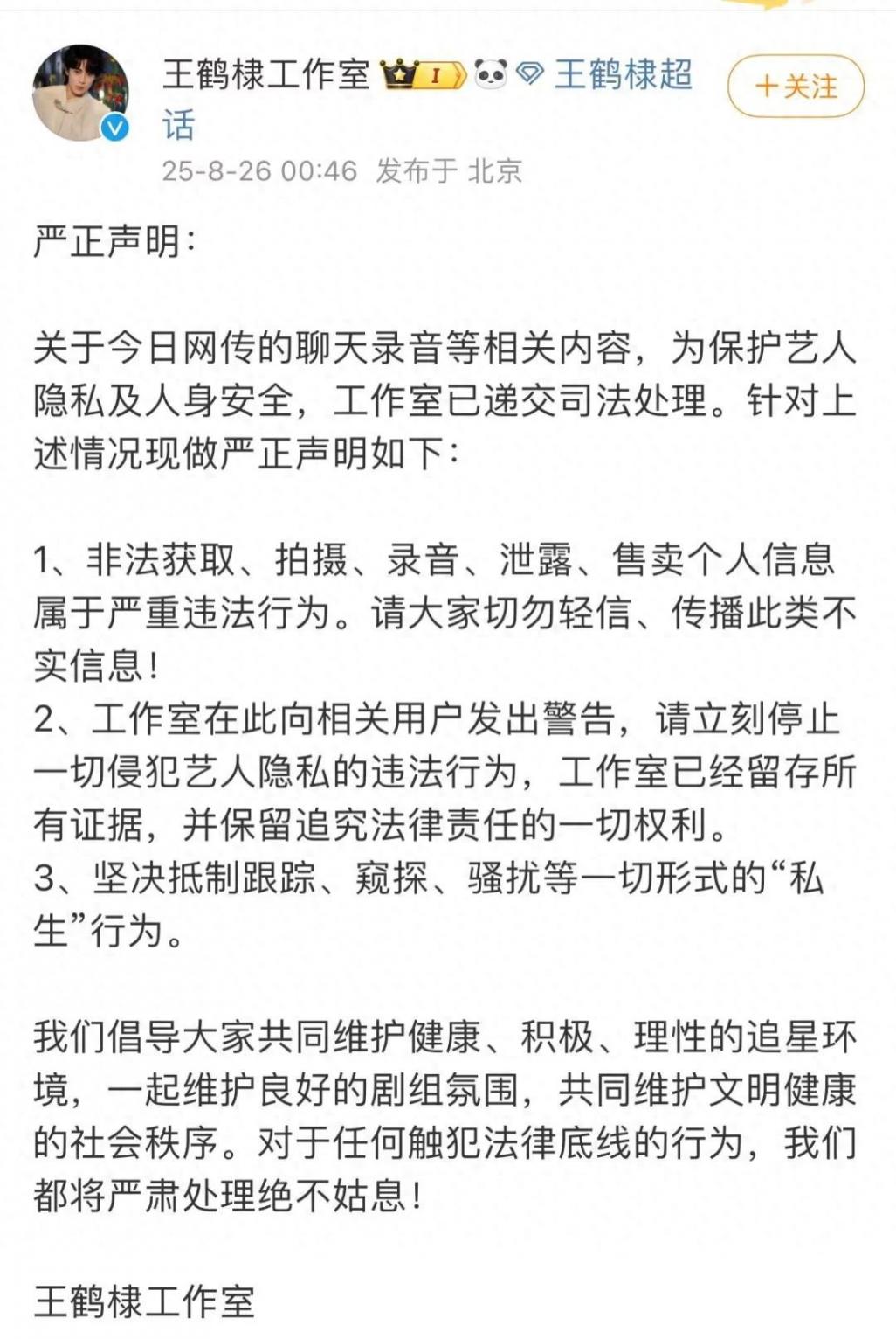 26日凌晨00:46,王鹤棣工作室发布严正声明提到,“网传的聊天录音等相关内容,为保护艺人隐私及人身安全,工作室已递交司法处理。”