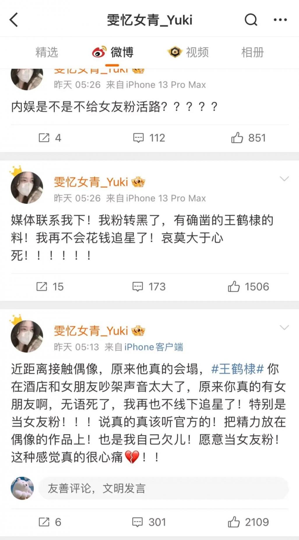 极目新闻记者注意到,其实,“雯忆女青_Yuki”25日05:13分就开始发博,表示“近距离接触偶像,原来他真的会塌,王鹤棣你在酒店和女朋友吵架声音太大了,原来你真的有女朋友啊,无语死了,我再也不线下追星了!特别是当女友粉!!!”