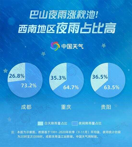 1100多年前的一个秋雨夜,客居异乡的诗人李商隐写下“巴山夜雨涨秋池”,说的就是华西地区多夜雨的特点。气象大数据也证实了四川、重庆一带的夜雨概率确实很高,多地六成以上降雨量出现在夜间。