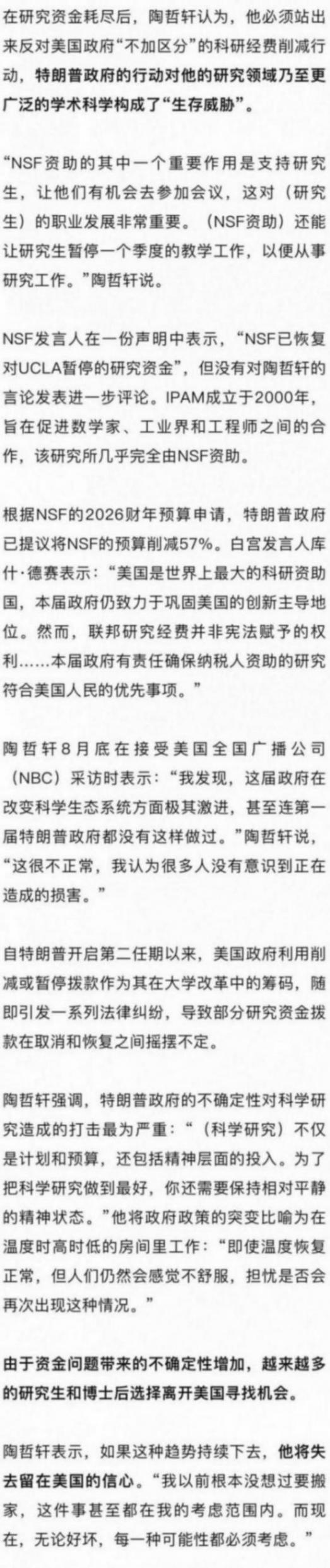 根据陶哲轩接受媒体采访时提供的信息,自今年8月起,他和所在的纯数学与应用数学研究所(Institute for Pure and Applied Mathematics, IPAM)失去了来自美国国家科学基金会(NSF)的拨款。