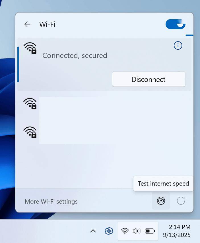 博主 @phantomofearth 在 X 平台上分享了这一发现,随着未来的更新,Windows 11 的网络弹出窗口将在 Wi-Fi 刷新按钮(这是另一项微软耗时许久才实现的实用按钮)旁新增一个测速按钮,用户可通过该按钮快速启动在线网络测速。此外,右键点击网络指示器弹出的上下文菜单中,也将新增一个类似的快捷方式,该快捷方式将紧邻网络故障排除和网络设置选项。
