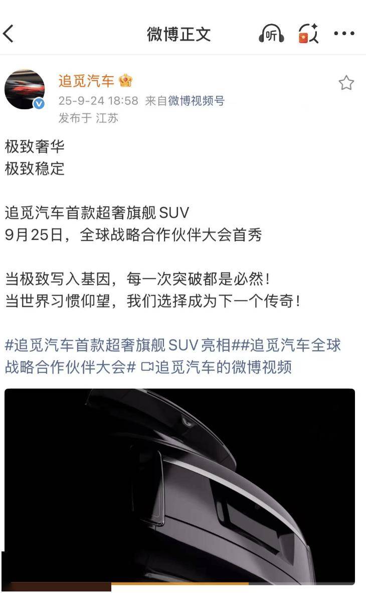 9月24日,追觅汽车今日透露,旗下第二款车辆产品将在9月25日举行的首届全球战略合作伙伴大会上首秀。从外形来看,新车酷似劳斯劳斯库里南,官方定位为家族首款超奢旗舰SUV。官方表示, “性能纯电轿跑+超奢旗舰SUV” 的多产品矩阵将互补,覆盖不同高端细分市场需求。据悉,两款产品计划在2027年上市。