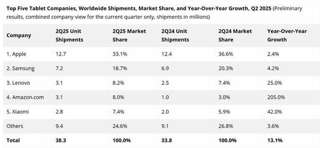 IDC《全球季度个人计算设备跟踪报告》显示,2025 年第二季度全球平板出货量 3830 万台,苹果和三星销量稳居前二,联想则以 310 万台、8.2 % 的份额连续三个季度位列第三,同比增速 25 %,在前五名中增速仅次于排在第四的亚马逊。小米位列第五,销量达280万台。