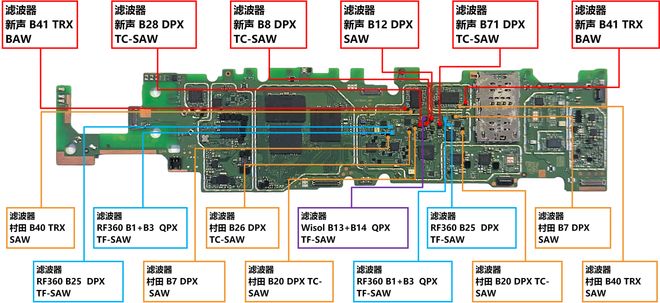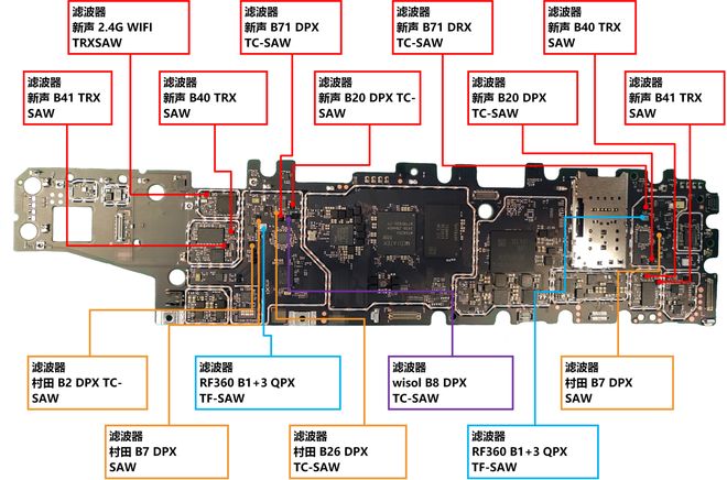 上图是联想小新PAD 11拆机后的主板,通过对元器件的逐一分析发现,国产物料与进口产品交织分布,并展现出高度国产化的特征,尤其是过去国产占比极低的滤波器表现亮眼。其中,滤波器又以新声半导体的产品数量最为突出,在联想小新PAD 11中新声一共贡献了6颗滤波器,其中2颗BAW为该平板的独家供应,3颗TC-SAW与国际巨头村田平分秋色。