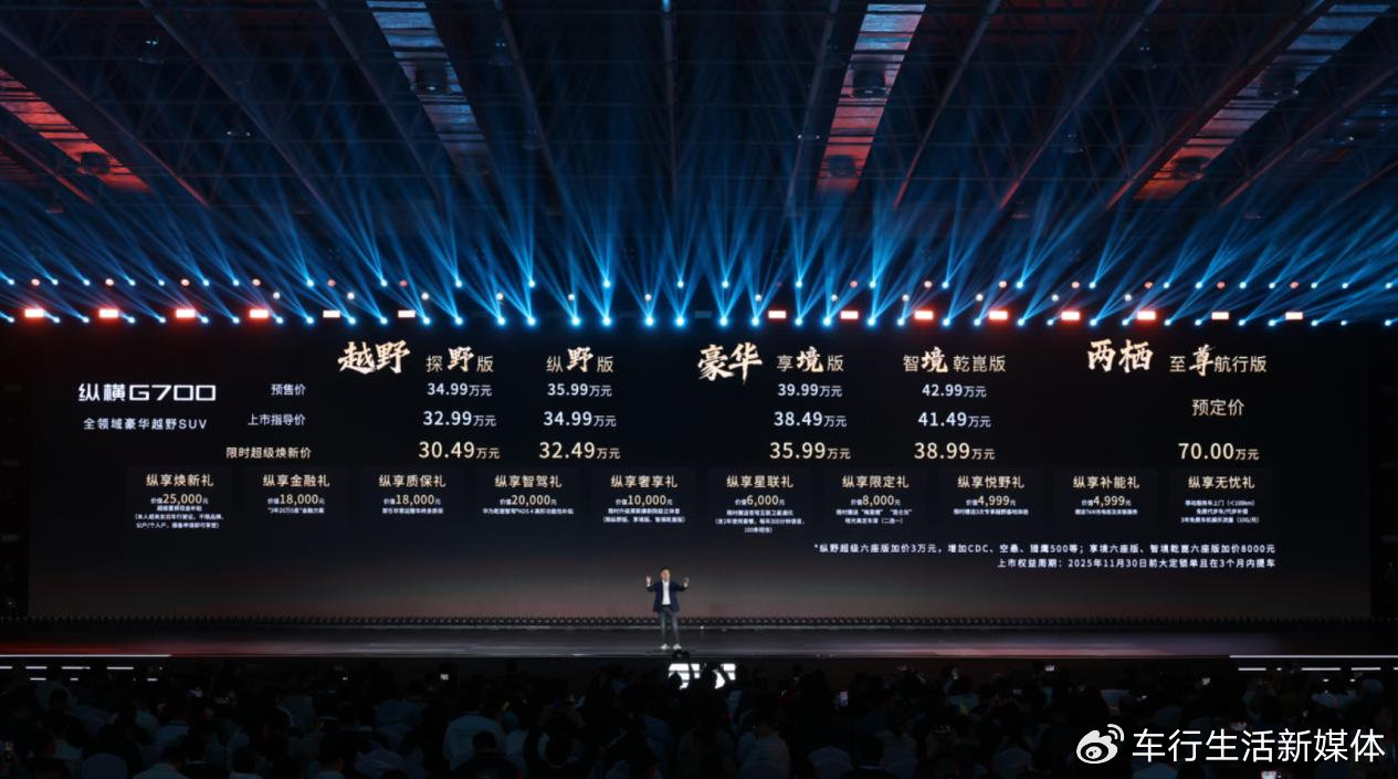 纵横G700的定价颇具深意。32.99万起的售价,恰好卡在传统豪华品牌入门车型与专业越野车之间的市场空档。这个价格,比同级别的进口车型低了不止一个档次,但却提供了越级的配置与性能。