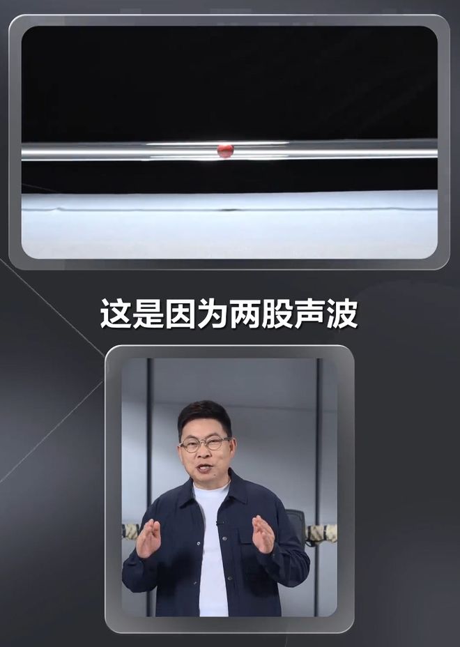 余承东进行了一场小球实验并介绍了降噪耳机的原理,他称声音是以波的形式传播的,打开音箱时,声波会释放能量把小球推向另外一端,此时在另外一端播放一段反向的声波,小球就会被推回中间,并停止运动。这是因为两股声波相互抵消了,而降噪耳机就是用的这个原理。