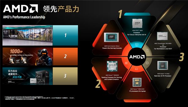 面向云计算、企业、AI的EPYC 9005系列,面向工作站与发烧桌面的ThreadRipper 9000系列,面向AI PC的锐龙AI Max 300系列,面向游戏本的锐龙9000HX3D系列,面向游戏与内容创作的锐龙9000X3D系列,面向游戏主机的半定制芯片……